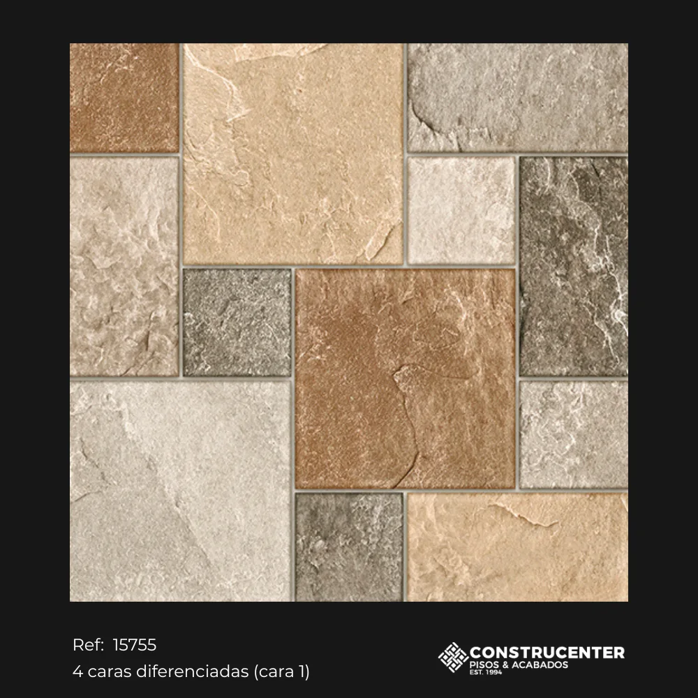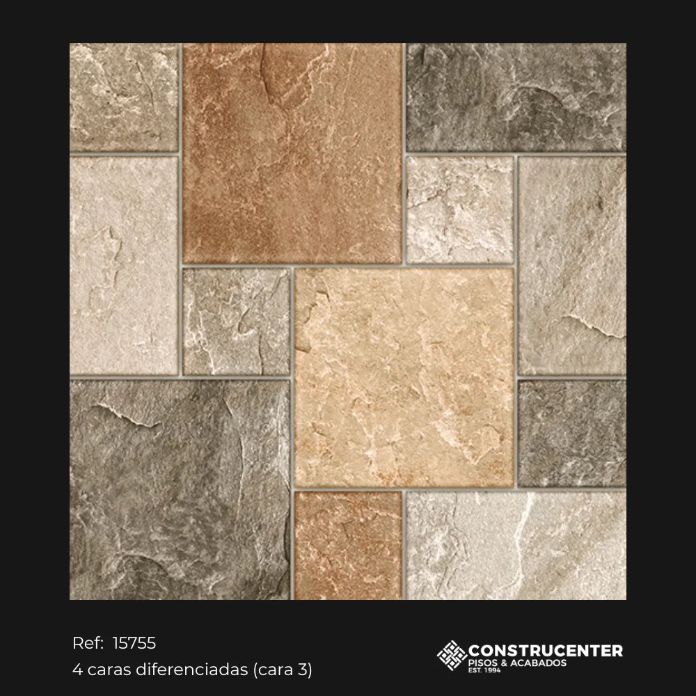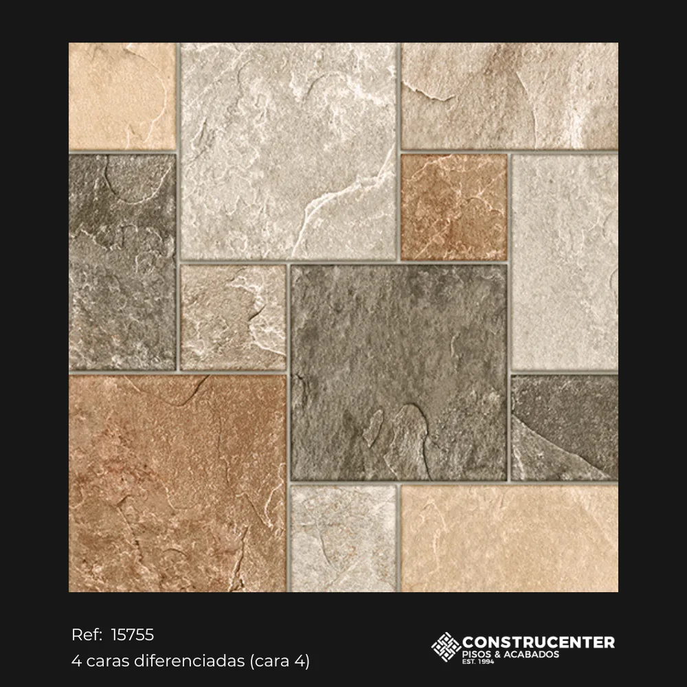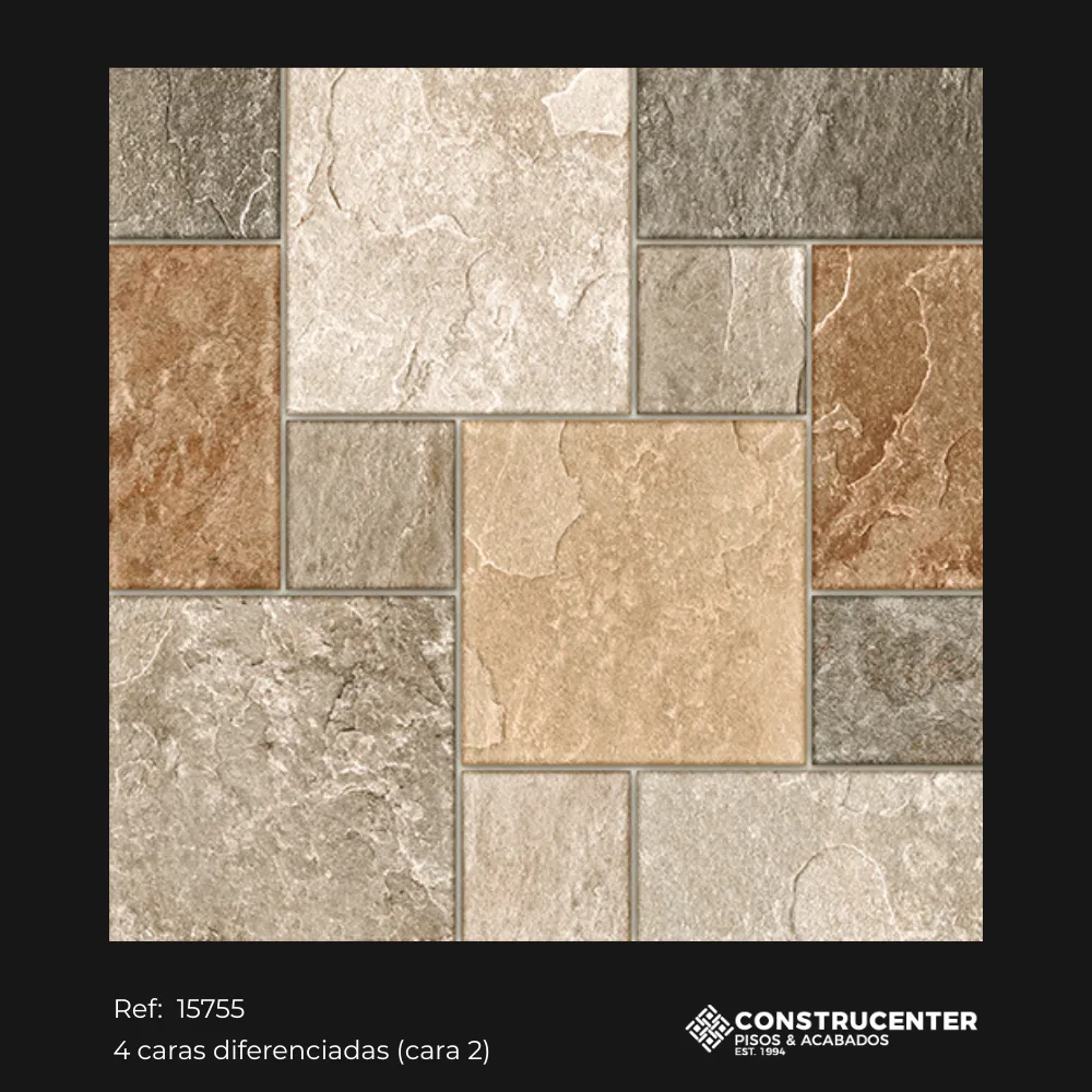 Con diseño multiformato tipo piedra en tonos beige, marrón y gris aporta calidez y autenticidad a los espacios residenciales. Su acabado rústico antideslizante y variación tonal moderada combina seguridad y estética natural. Con cuatro caras diferenciadas, este piso imita fielmente la textura de la piedra irregular, ofreciendo una solución práctica, duradera y decorativa para interiores y exteriores.