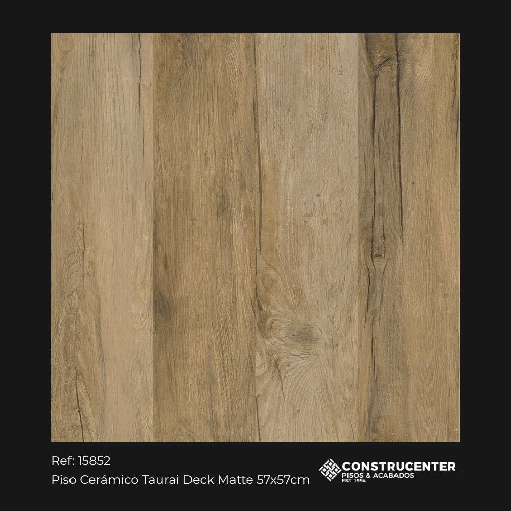 Este piso cerámico tipo madera Tauari Deck aporta la calidez visual de un deck natural, con vetas y nudos suaves que se sienten auténticos y fáciles de combinar. Su tono madera beige–miel crea ambientes acogedores y modernos, perfectos para salas, comedores, habitaciones o estudios donde buscas un look orgánico sin recargar el diseño.