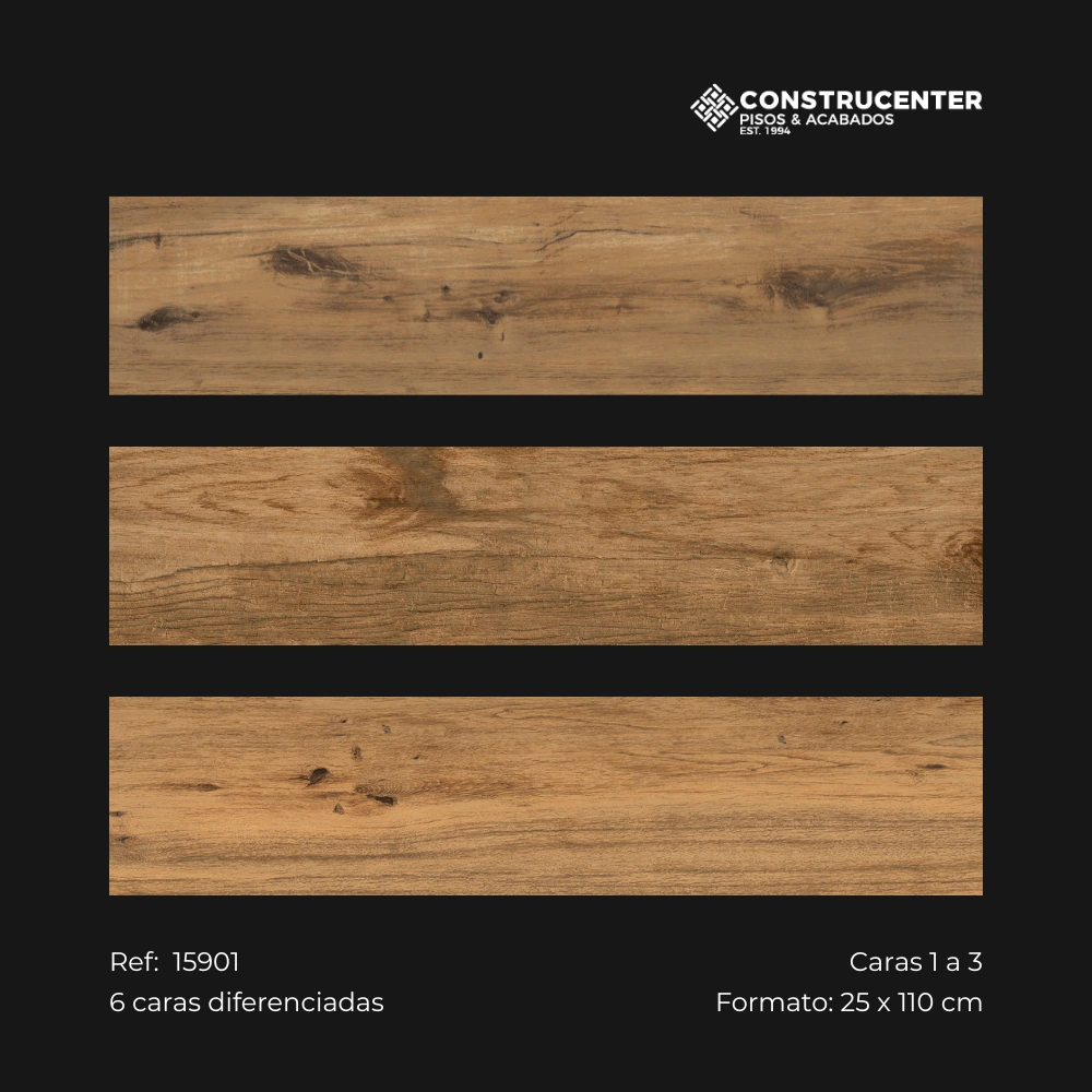 El acabado satinado le da una sensación más sobria y elegante (sin brillos excesivos), y su formato tipo tablón ayuda a lograr un efecto continuo y amplio. Además, puedes usarlo también como revestimiento cerámico para paredes y fachadas, ideal para proyectos que buscan continuidad visual entre pisos y muros.