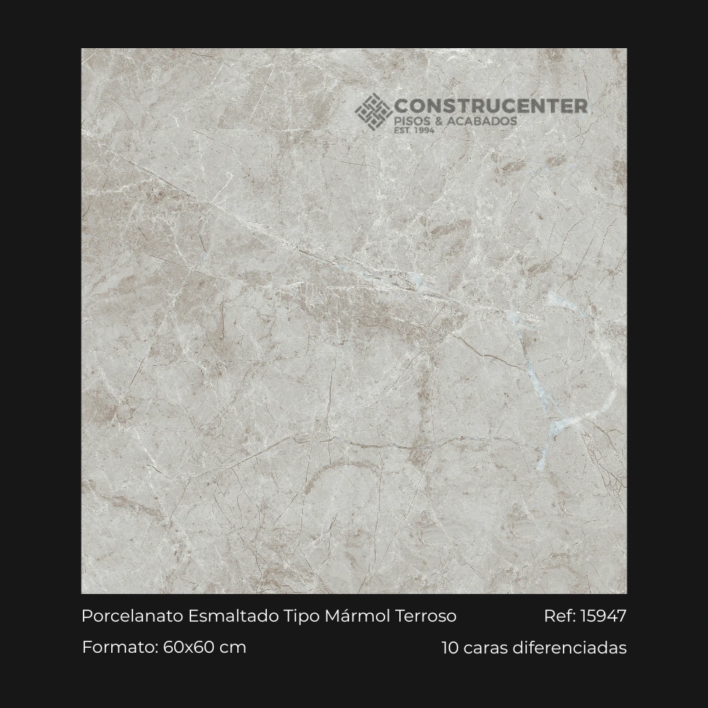 Revestimiento porcelanato esmaltado en formato 60×60 cm destaca por su diseño inspirado en el mármol natural, presentando una tonalidad terrosa con vetas sutiles que aportan profundidad a cualquier espacio. Su acabado esmaltado ofrece un aspecto contemporáneo y sofisticado.